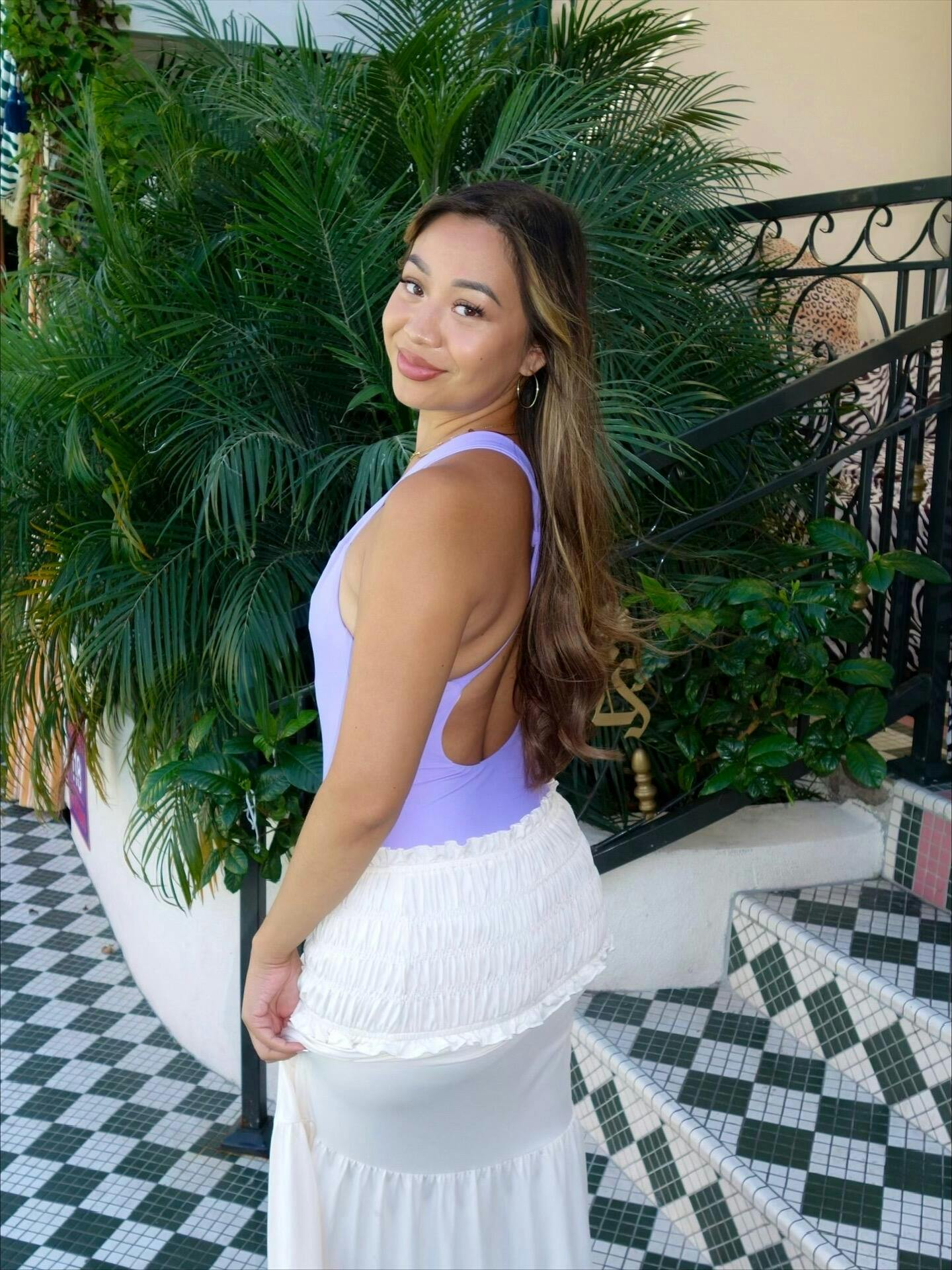 The design really snatches you and the color is so pretty. I paired the swimsuit with a long flowy skirt - which is a perfect daytime look on the beach. The tie in front adds an extra girly flair